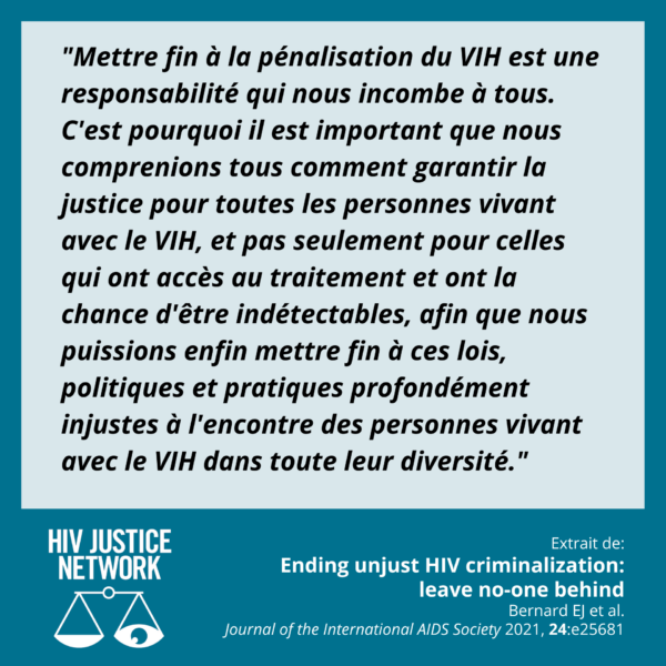 Dans un article publié dans le Journal of the International AIDS Society, les auteurs (Edwin J Bernard, directeur exécutif du HJN, Michaela Clayton, membre du conseil de surveillance du HJN, Edwin Cameron, membre du comité consultatif mondial du HJN, Chris Beyrer, professeur de santé publique et de droits de l'hommeet de droits de l'homme à la Johns Hopkins Bloomberg School of Public Health, et Alexandra Volgina, du GNP+), ont noté qu'en dépit des nombreux progrès réalisés dans le domaine de la science du VIH, il reste un sujet qui "pose toujours une menace à la vie et au bien-être des personnes vivant avec le VIH, ainsi qu'à l'objectif de mettre fin à l'épidémie", à savoir la pénalisation du VIH".