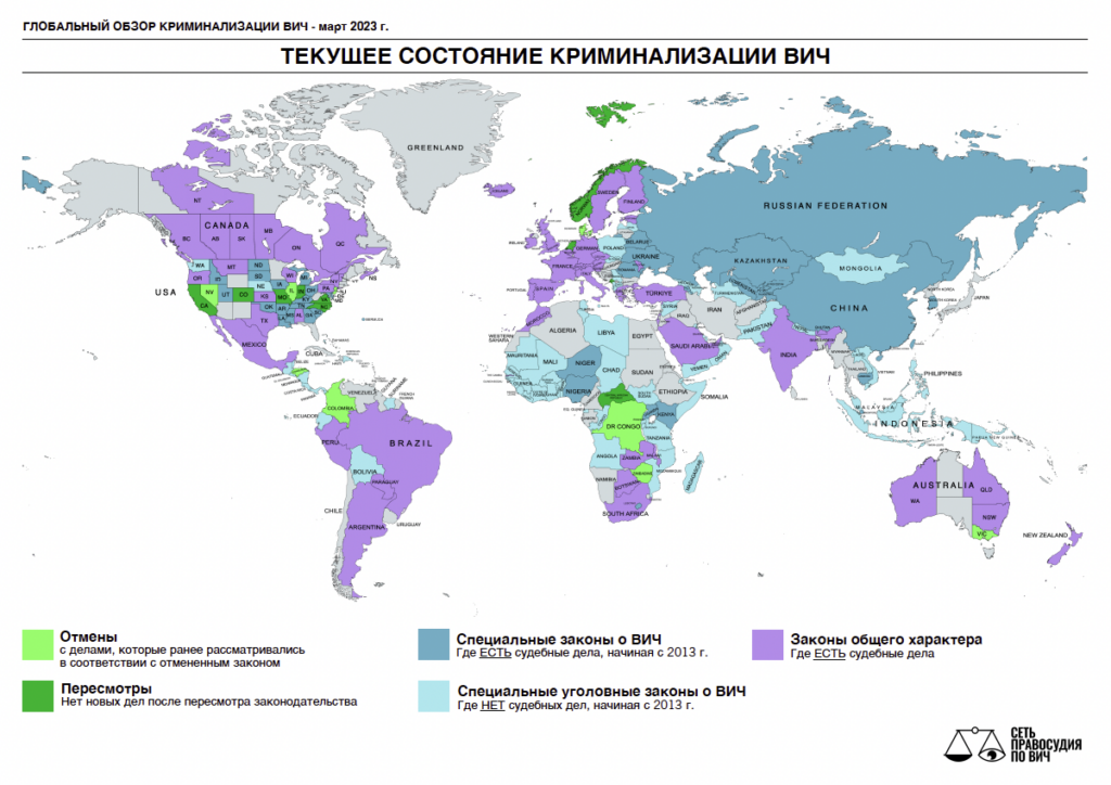 По состоянию на март 2023 г., в 91 стране (114 юрисдикциях) действует, в том или ином виде, уголовный закон, относящийся к ВИЧ, а еще в 41 стране (61 юрисдикциях) для преследования людей, живущих с ВИЧ, за нераскрытие ВИЧ-статуса, предполагаемое или возможное поставление в опасность заражения ВИЧ и/или неумышленную передачу вируса применяют общее уголовное законодательство.