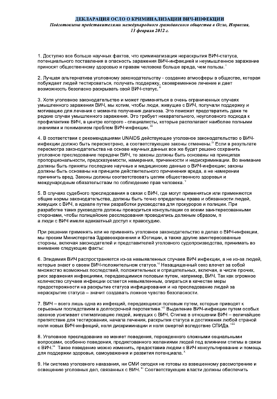 'ДЕКЛАРАЦИЯ ОСЛО О КРИМИНАЛИЗАЦИИ ВИЧ-ИНФЕКЦИИ', 2012